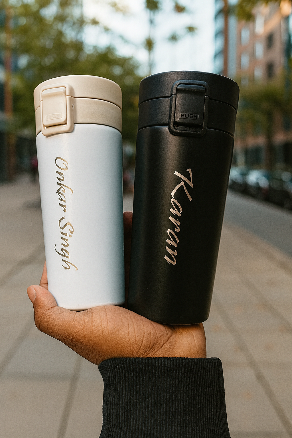 The smart push-button lock lid ensures spill-free use, while the sleek matte finish makes it look premium. Add the name of your loved one to make it a meaningful, personalised gift for birthdays, anniversaries, or everyday use.